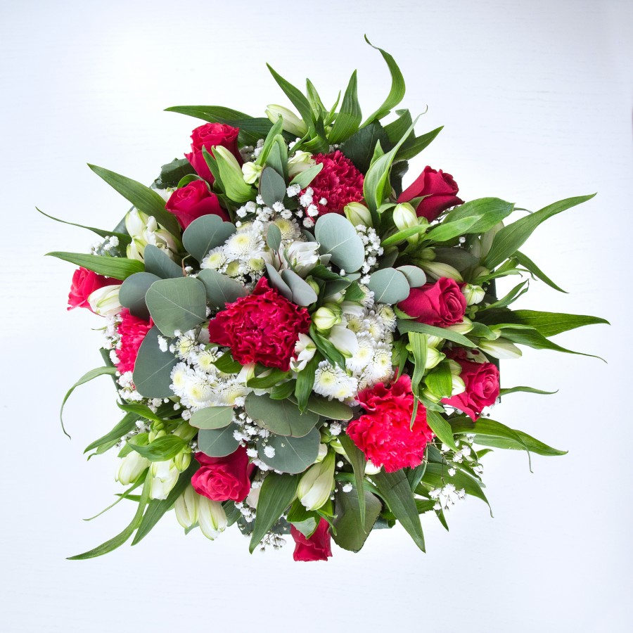Immerse yourself in a breathtaking display of nature’s artistry with our unique bouquet. Expertly arranged are stunning red roses, soft carnations, pristine white chrysanthemums, delicate gypsophila, graceful white alstroemeria, and lush aspidistra leaves. Each bloom is hand-selected for exceptional quality and freshness, promising an unforgettable floral experience.