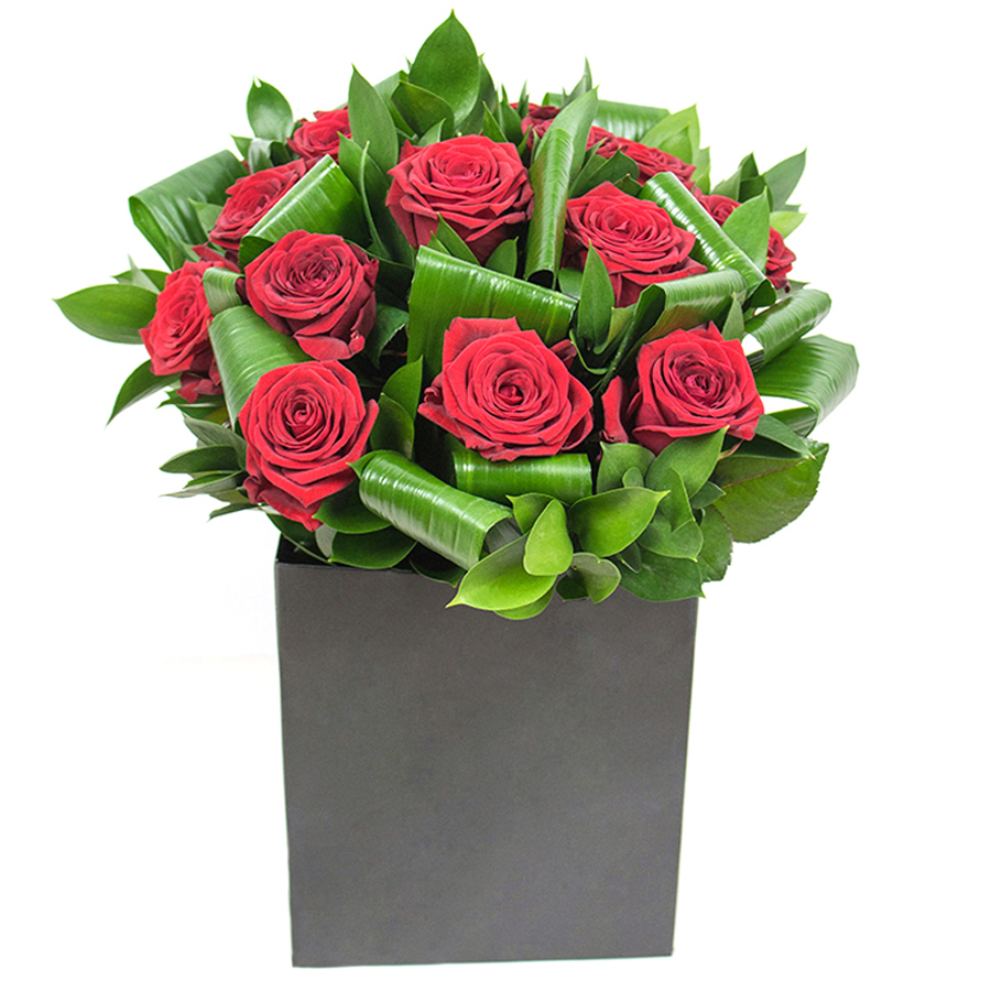 Our elegant red rose arrangement combines vibrant red roses with lush aspidistra leaves and delicate ruscus, creating a unique and stylish centerpiece for any room.