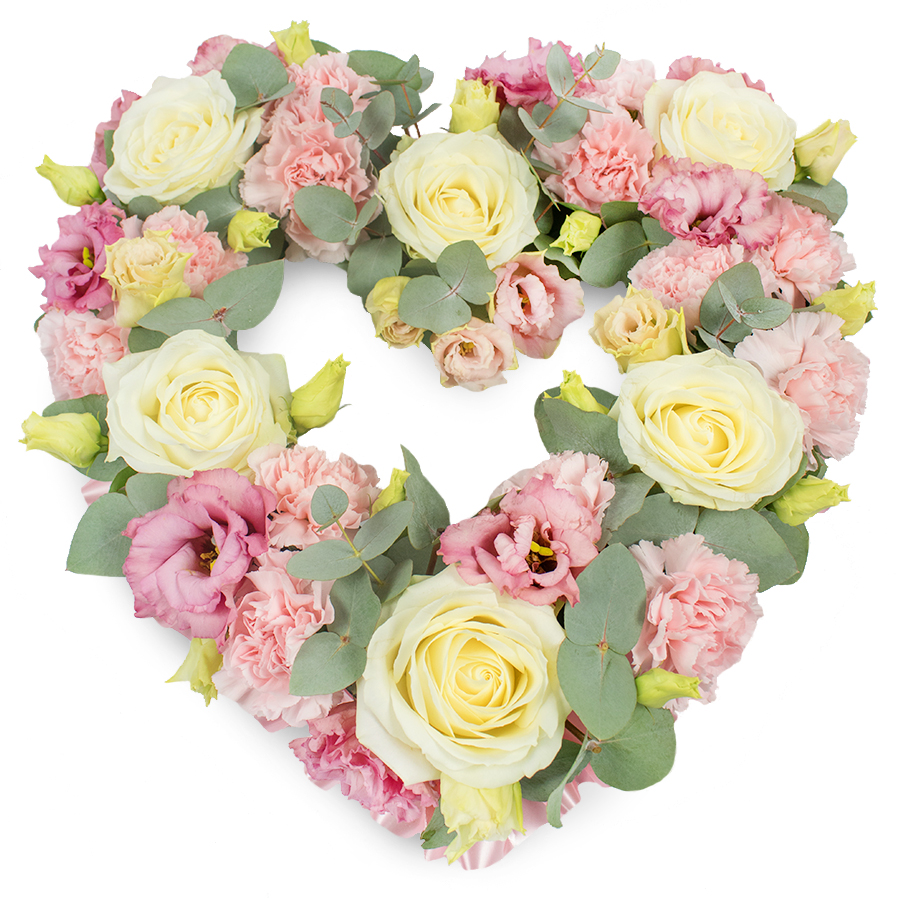 Our graceful open heart bouquet is the perfect way to honor and remember a loved one. This exquisite arrangement features a delicate combination of white roses, pink carnations, pink lisianthus, and eucalyptus leaves, all carefully chosen for their quality and freshness.